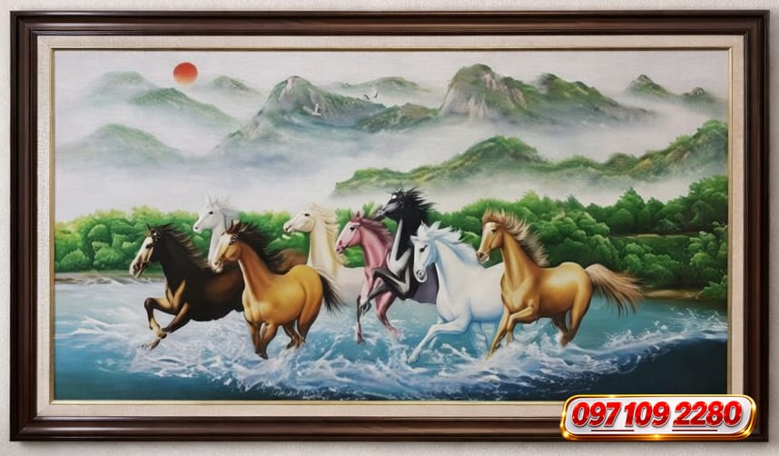 Tranh Mã Đáo Thành Công sơn thủy nghệ thuật là sự kết hợp tinh tế giữa hình tượng bát mã phi nước đại và không gian sơn thủy hữu tình. Bức tranh không chỉ mang giá trị thẩm mỹ cao mà còn ẩn chứa ý nghĩa phong thủy sâu sắc, tượng trưng cho thành công viên mãn – tài lộc hội tụ – sự nghiệp thăng hoa bền vững.