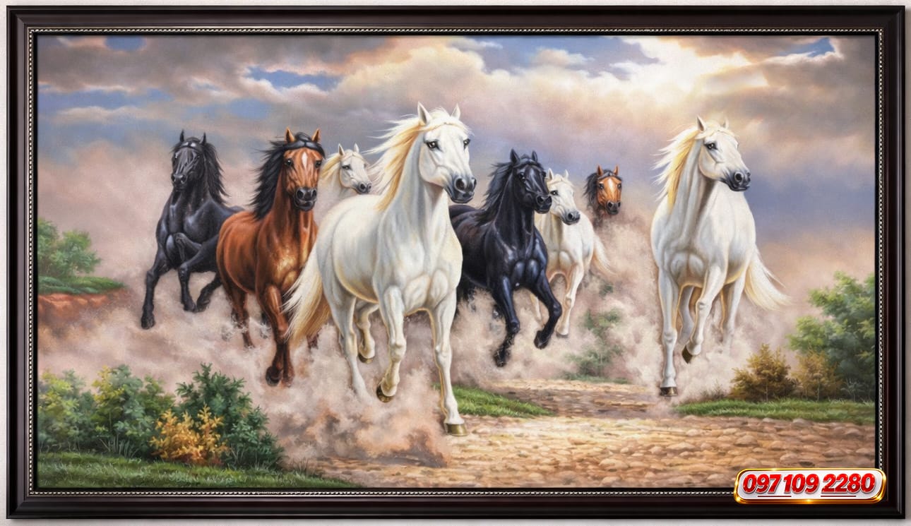 Tranh mã đáo thành công thường vẽ 8 chú ngựa (bát mã), tượng trưng cho phát tài – phát lộc. Khi treo trong phòng làm việc, bức tranh giúp: