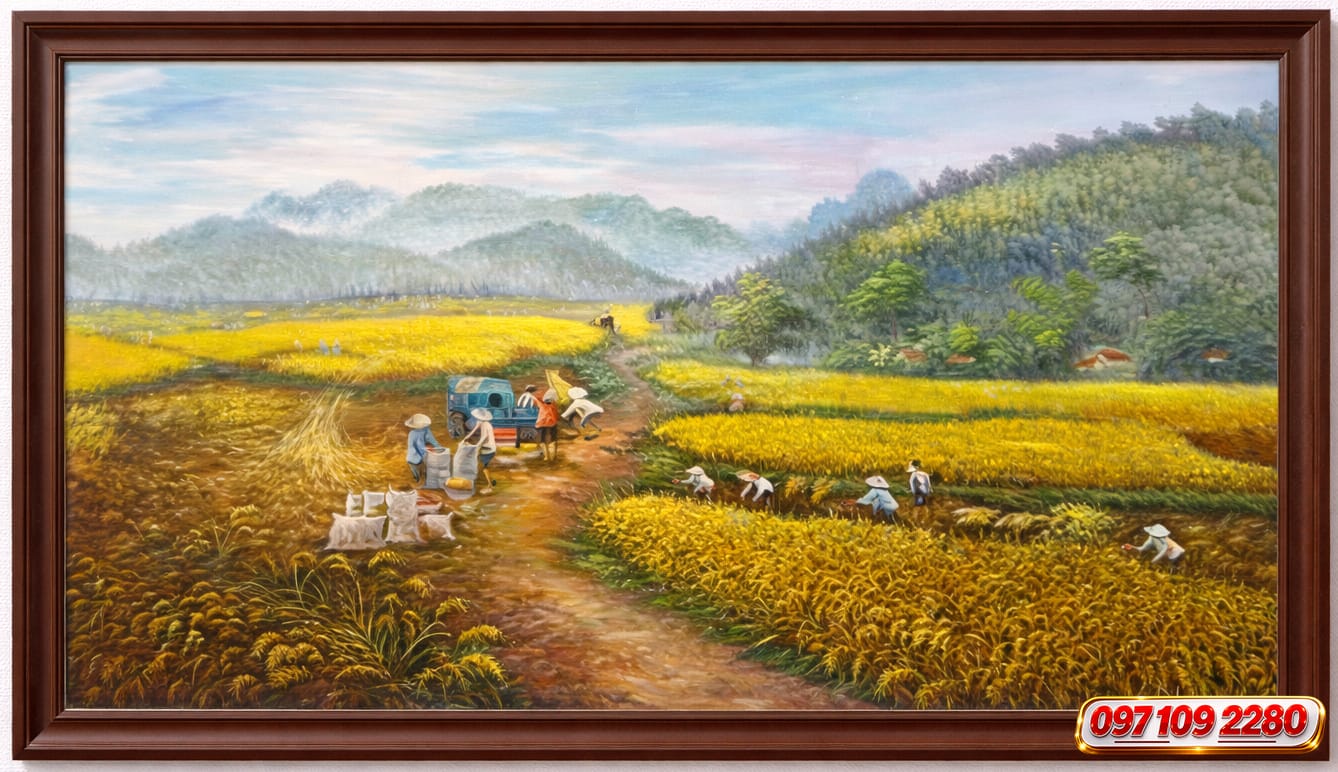 Giữa sắc vàng rực rỡ của đồng lúa chín, tranh mùa gặt thu hoạch lúa mở ra một khung cảnh làng quê Việt Nam no ấm, yên bình và tràn đầy sức sống. Không chỉ tái hiện vẻ đẹp thiên nhiên trù phú, bức tranh còn là lời kể mộc mạc về lao động, về sự gắn bó bền chặt giữa con người và ruộng đồng – nơi nuôi dưỡng bao thế hệ người Việt.