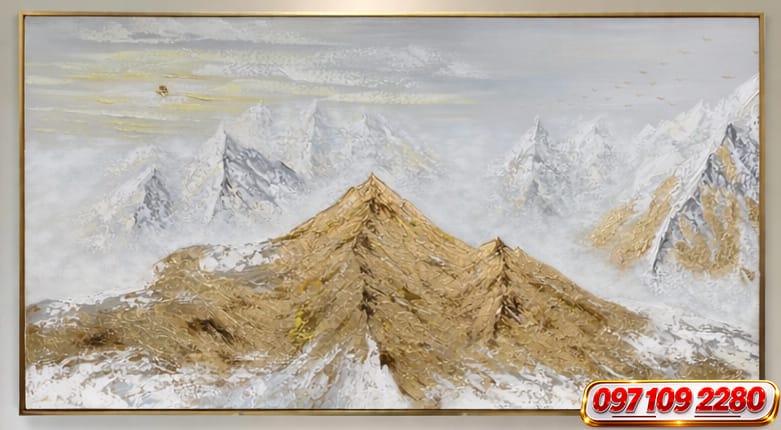 Tranh sơn dầu núi vàng nổi bật với hình ảnh dãy núi hùng vĩ được phủ sắc vàng sang trọng, kết hợp cùng gam màu trắng – xám của tuyết và sương mù tạo nên chiều sâu nghệ thuật độc đáo.